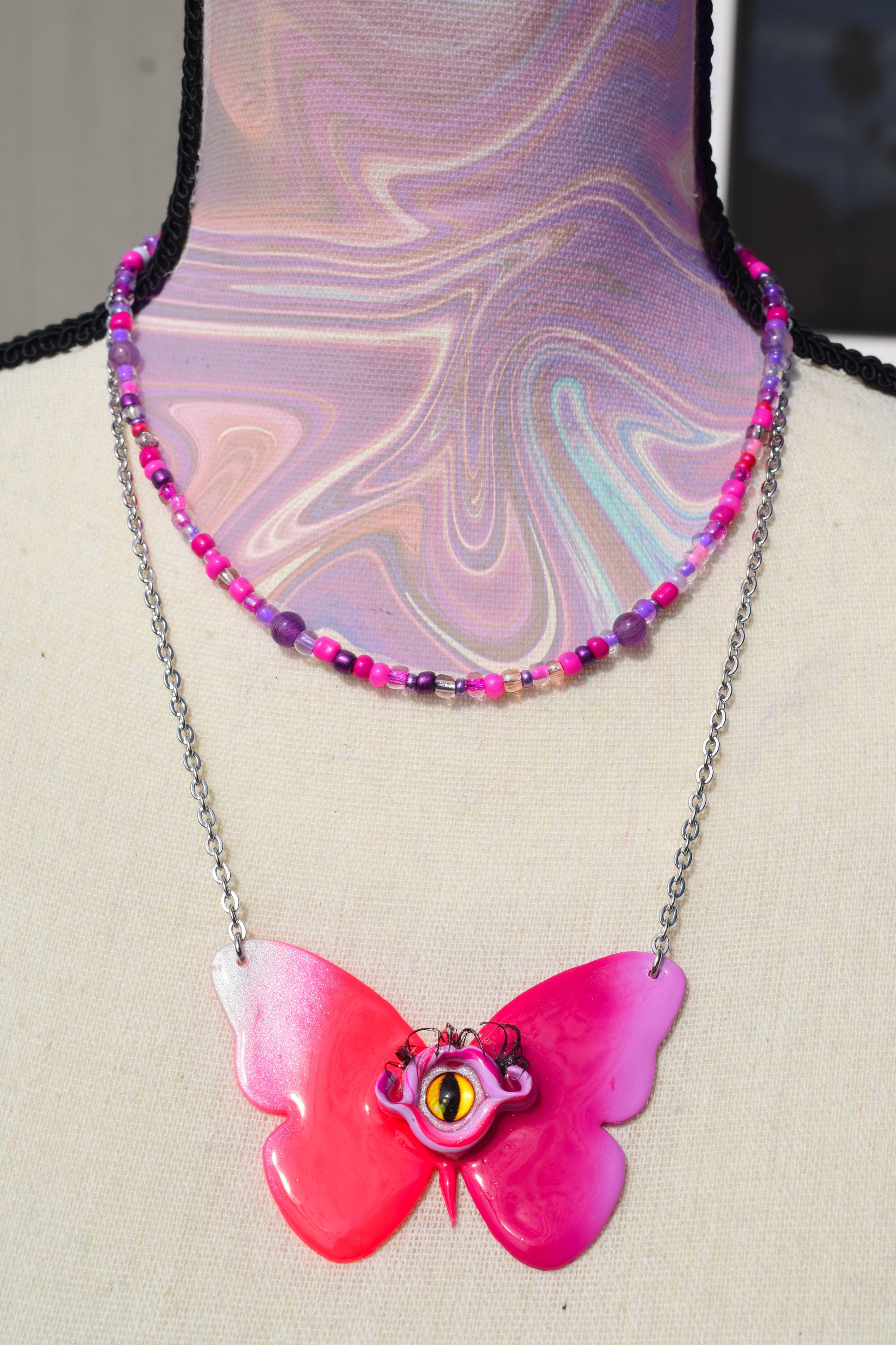 Flutter into magic with this Mariposa Necklace, handcrafted from clay and stainless steel. Each necklace comes with a matching glass bead/crystal choker, perfect for mixing and matching with your other accessories!